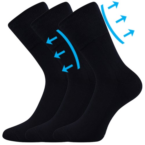 Ponožky majú špeciálny predĺžený extra voľný lem ktorý neškrtí ani silné alebo opuchnuté nohy, čo ocenia hlavne diabetici a osoby s problémami obehového systému. Zosilnené froté majú ponožky na chodidle, priehlavok a horná časť ponožky je slabá. Špica je uzavretá náročnejším retiazkovaním, vďaka ktorému je spoj dokonale hladký a nehrozí, že ponožka bude tlačiť. Vysoký podiel bavlny je veľmi príjemný na dotyk a výborne saje pot.